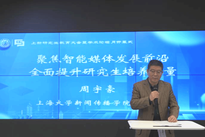 上海大学新闻传播学院副院长周宇豪以《聚焦智能媒体发展前沿 全面提升研究生培养质量》为题做了研究生工作报告,系统回顾了过去五年学院在研究生教育培养方面取得的成效,包括课程建设、科研创新、招生质量、导师队伍建设等方面的显著进展。他同时指出存在的问题,并对未来发展作出重点规划:严把论文与实践成果质量关、提升课堂教学水平、加强学术交流与合作、深化实践育人机制。他强调,学院将持续推进研究生教育改革,为国家输送更多高素质新闻传播人才。