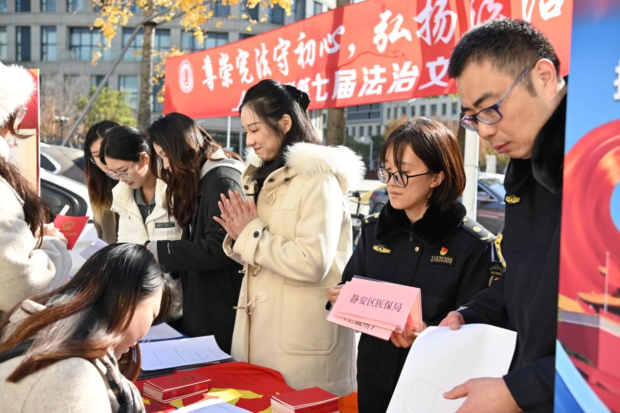 开幕式当日中午,法学院携手静安区城管执法局、静安区疾控中心,联动上海大学法学院公共法律服务中心、律舟法律援助社、青年法律志愿者服务团等志愿力量,在东区食堂、水秀食堂门前同步开启“沉浸式”普法服务。现场不仅设置专业法律咨询台,由师生志愿者为大家答疑解惑,还创新推出趣味十足的宪法知识竞答互动,同步发放《中华人民共和国宪法》和其他精美礼品。通俗易懂的讲解、接地气的互动形式,吸引了很多师生驻足参与、踊跃交流,让法治知识在轻松氛围中深入人心。