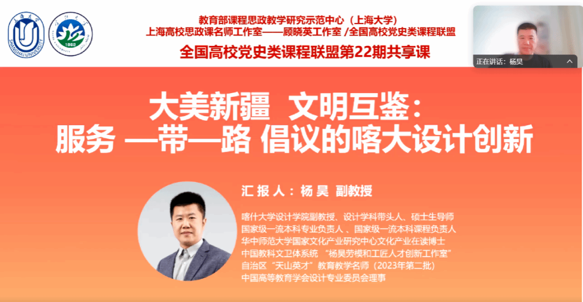 2025年12月8日下午,“大美新疆 文明互鉴:服务‘一带一路’倡议的喀大设计创新”第22期全国高校党史类课程联盟共享课开讲。喀什大学设计学院设计学科专业带头人、硕士研究生导师、华中师范大学国家文化产业研究中心在读博士杨昊副教授作了线上分享。