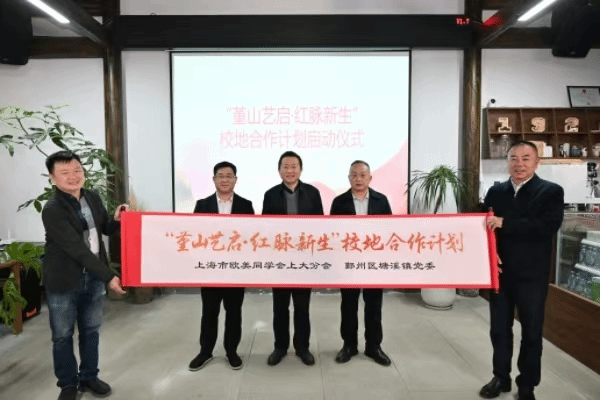 随后,在上海大学和宁波市双方领导的见证下,上海大学人才工作办公室副主任、上海市欧美同学会上大分会副会长张舜卿与塘溪镇党委书记周时奋共同展开启动卷轴,全面启动了“堇山艺启·红脉新生”六大校地合作计划。