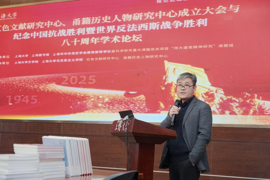 12月28日,由上海大学、上海图书馆、上海市中共党史学会、教育部哲学社会科学研究重大课题攻关项目“伟大建党精神研究”课题组共同主办,上海大学文学院、马克思主义学院、红色文献研究中心、甬籍历史人物研究中心共同承办的“红色文献研究中心、甬籍历史人物研究中心成立大会与纪念中国抗战胜利暨世界反法西斯战争胜利八十周年学术论坛”在上海大学乐乎新楼思源厅举行。