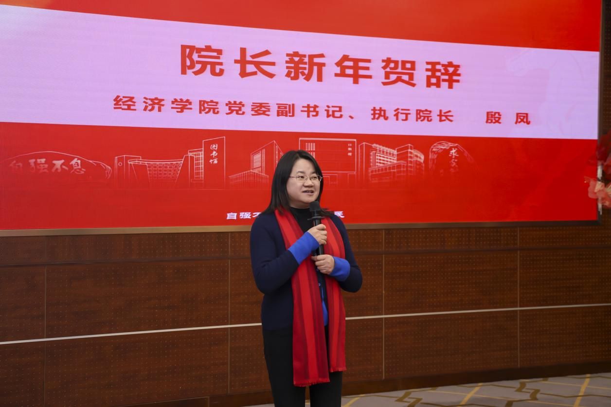 最后,经济学院党委副书记、执行院长殷凤致新年贺词。她向全体师生的躬身耕耘与社会各界的鼎力支持致以诚挚谢意,表示经济学院的发展始终与国家经济脉搏同频、与学校“双一流”建设同向。殷凤寄语学院同仁心怀梦想,敢想敢为,善作善成,久久为功。未来,学院将深耕经世济民之学,培养全面发展的卓越创新人才,朝着建设与中国特色、世界一流大学相匹配的“最好的经济学院”目标笃定前行,不负时代使命与师生期许。
