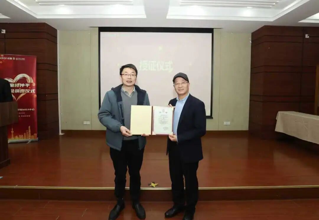 在全场嘉宾的见证下,陈方泉处长与楼仲平董事长分别代表上海大学与义乌双童集团正式签署捐赠协议。镇璐院长随后向楼仲平先生颁发了捐赠证书及奖杯,这不仅是对楼先生慷慨善举的表彰,更彰显了双方携手育人、共担社会责任的坚定决心。