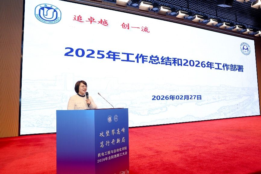 为更好地总结过往成果,交流经验,表彰先进,凝聚力量,谋划未来发展,2月27日,机自学院“攻坚攀高峰,笃行开新局”——2026年全院教职工大会在宝山校区图书馆报告厅顺利召开。上海大学终身教授、原上海大学党委书记、常务副校长方明伦,原上海电力学院校长、原上海市电站自动化技术重点实验室主任曹家麟,上海大学发展规划部部长、战略规划处处长王刚,机自学院党委书记郭纯生,院长谢少荣,学院班子全体成员、各系/中心领导以及学院全体教职工出席了本次会议。