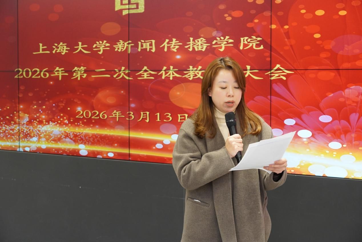 近日,上海大学新闻传播学院2026年第二次全体教师大会在上海智能媒体传播创新实验中心104室举行。学院党政领导班子成员及全体教师参加会议,会议由学院党委副书记、副院长王智君主持。