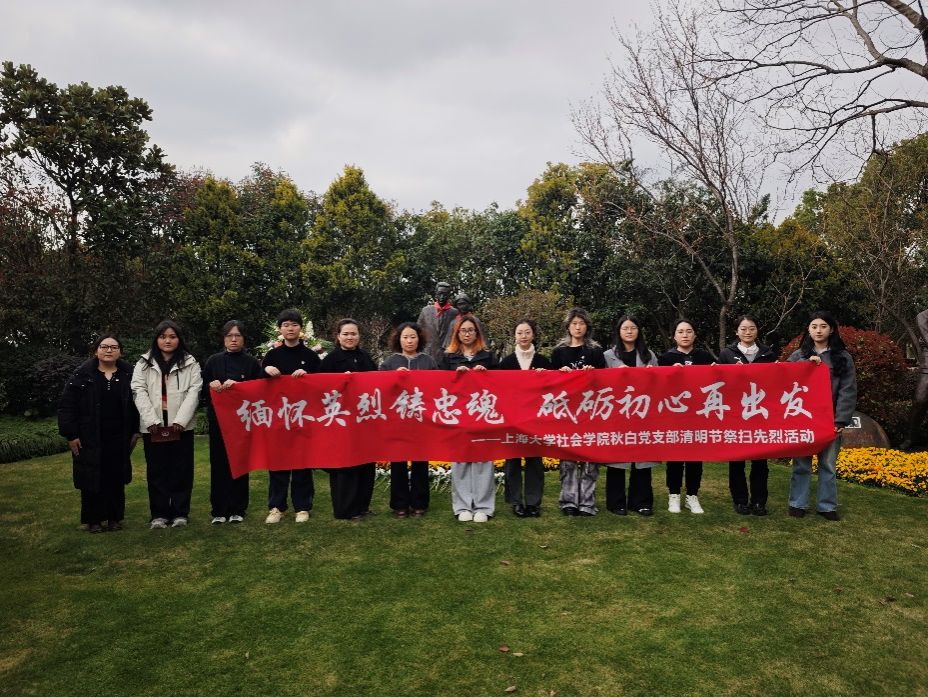 为深切缅怀革命先烈、赓续红色血脉,传承和弘扬秋白精神,3月23日下午,上海大学社会学院秋白党支部党员齐聚上海青浦福寿园内瞿秋白烈士墓前,以“缅怀先烈铸忠魂,砥砺初心再出发”为主题开展祭扫纪念活动,深情追念这位中国共产党早期主要领导人的革命伟绩,在庄严肃穆的仪式中感悟初心使命、凝聚奋进力量。社会学院党委副书记、副院长张乃琴,社会学院团委书记回胜男出席本次活动。活动由秋白党支部纪检委员付一竹主持。