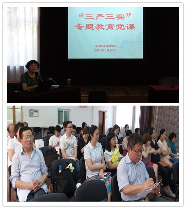 6月12日下午,在国际交流学院多功能厅,王海燕书记根据校党委学习实践“三严三实”专题教育的统一部署,结合国家外交战略、上海市重点工作、上海大学的三个工作重心和学院的实际情况,展现机遇、摆出问题、分析出路,给学院中心组及在国内的全体党员上了一堂生动的党课。