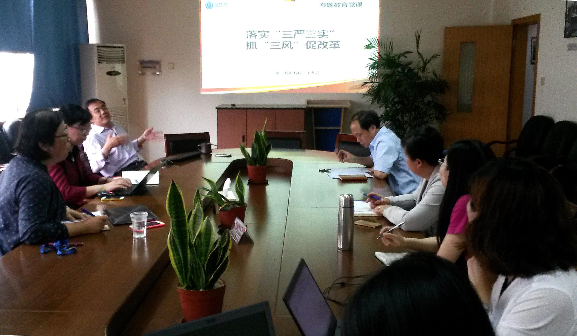学院前期召开党政联席会,会上按照上海大学党委印发《关于在我校处级以上领导干部中开展“三严三实”专题教育的实施方案》的通知要求,详细部署安排了学院“三严三实”专题教育的实施计划和步骤,以学院党委书记李双和常务副院长吕康娟讲专题党课作为第一步骤,正式启动教育学习安排。