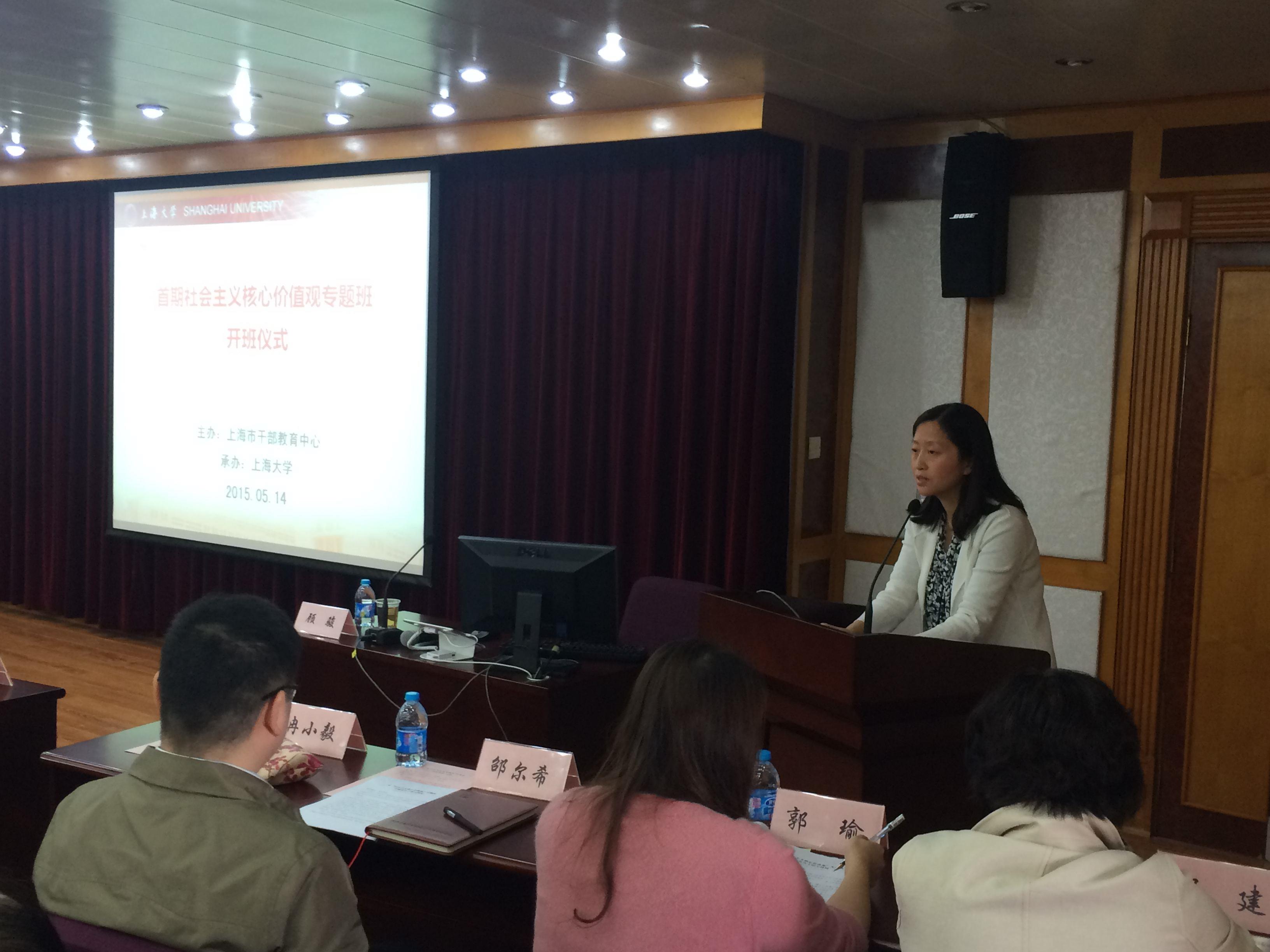 2015年5月14日下午14:00,2015年首期社会主义核心价值观专题培训在上海大学经管中心科技楼8楼报告厅开班。来自上海市各区县、委办局、企事单位的68名党政干部学员参加了开班仪式及首日学习,开班仪式由市委组织部干教中心主任冉小毅主持,上海大学党委组织部副部长、党校常务副校长曹为民为干部学员介绍课程设置及师资情况。