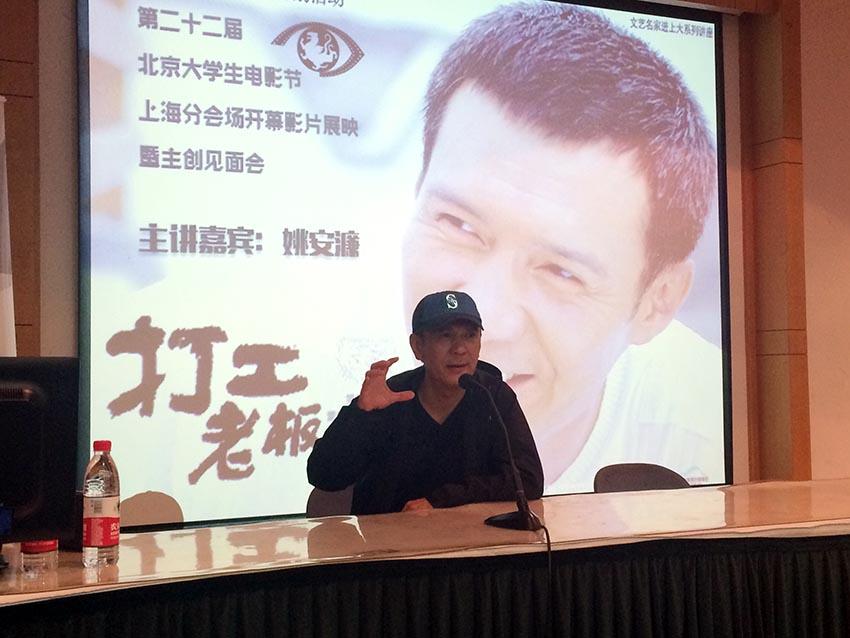 4月15日下午两点,姚安濂带着他出演的作品《打工老板》在上海大学J楼进行展映。他凭借着在《打工老板》里的出色表演夺得了第38届蒙特利尔国际电影节最佳男演员,成为当之无愧的“影帝”。作为第22届北京国际大学生电影节上海分会场展映会暨第七届传媒文化节电影下午茶专场,此次讲座的主题是“华语电影的银幕形象与表演艺术”,共持续两个半小时。出席此次讲座的有社区学院党委副书记陈伟平、影视学院学生工作负责人孙琦琰老师、影视学院艺术系党总支书记陈晓达老师以及影视学院团委书记严瑶老师等。期间,姚安濂老师针对当今华语电影的发展现状以及表演艺术与前来观看的老师、同学进行了亲切交流。