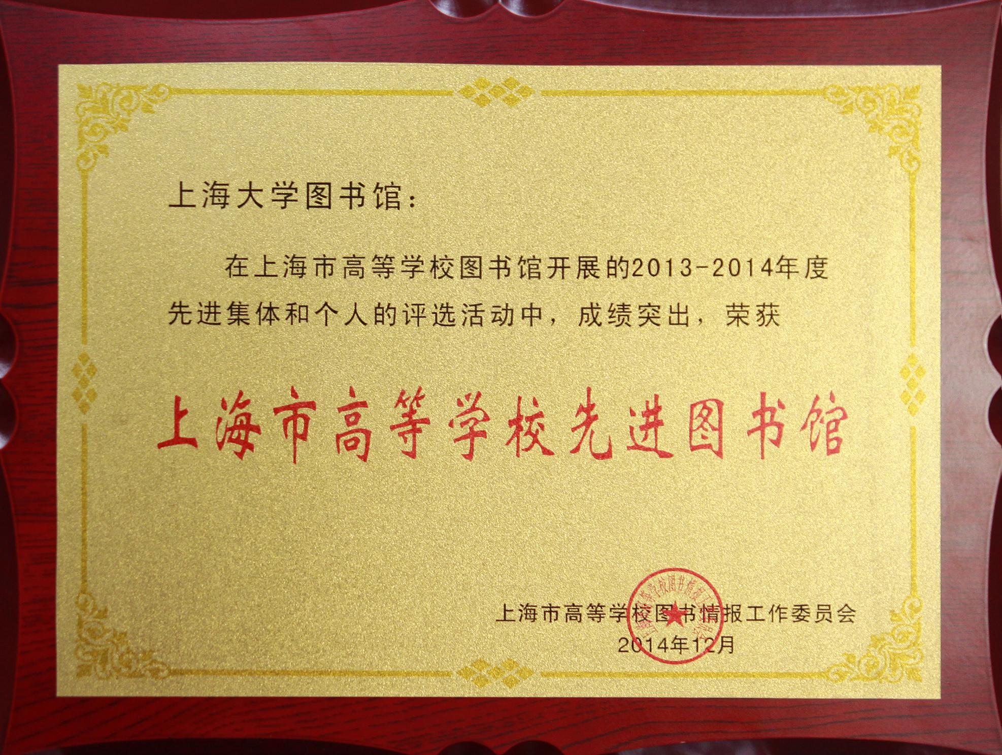 2014年12月31日,上海市高等学校图书馆情报工作委员会召开“2014年上海高校图工委年终总结会议”,对荣获2013-2014年度上海市高校图书馆先进集体和先进个人进行表彰。凭借优良的管理和服务,上海大学图书馆被授予“2013-2014年度上海市高等学校先进图书馆”,徐志娟、万燕平、詹华清、马国栋、李柯被授予“上海市高等学校图书馆先进个人”荣誉称号。