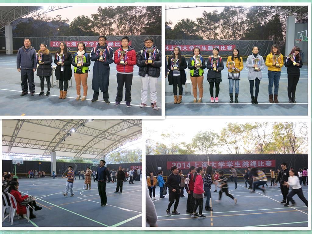 2014年12月30日,2014年上海大学学生跳绳比赛在风雨操场火热开赛,我校近百名学生参加了本次大赛。各院系高手云集,踊跃参赛,发扬团结协作的精神。除各单项桂冠各有所属,通信学院、材料学院、社区人文经管学院、社区理一、机自学院、悉尼工商学院、法学院、影视学院分获男子团体前八名。而女子前八则由材料学院、社区人文经管学院、社区理一、通信学院、理学院、机自学院、悉尼工商学院、影视学院获得。