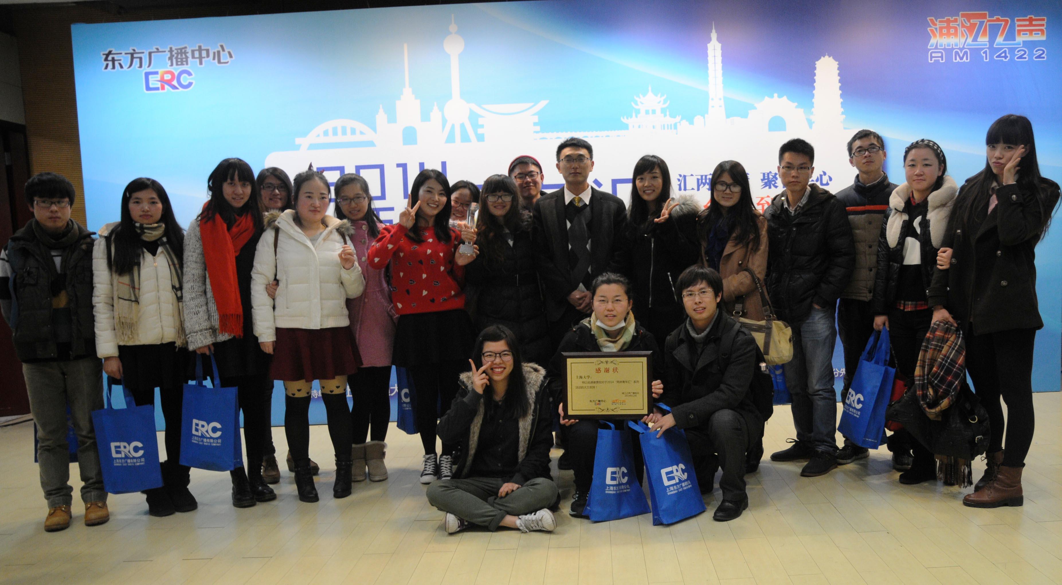 12月21日下午,由上海市人民政府台湾事务办公室指导、浦江之声电台主办的2014“两岸青年汇”活动顺利落下帷幕,2014“两岸青年汇”活动汇报会暨表彰大会在复旦大学隆重举行,上海市台办副主任瞿国樑先生、上海广播电视台副总编辑、东方广播中心党委书记、主任王治平先生等领导出席此次大会并致辞,参加此次汇报会的还有各高校港澳台办公室负责人,来自新华社、中新社、电视新闻中心等媒体记者以及两岸学生代表共150人左右。上海大学港澳台事务办公室也受邀参加了此次大会,上海市台办副主任瞿国樑先生等领导为我校正式颁发了 “最佳创意奖”奖杯和“感谢状”奖牌,以表彰我校港澳台办对上海市人民政府台湾事务办公室和浦江之声电台2014“两岸青年汇”工作的大力支持。