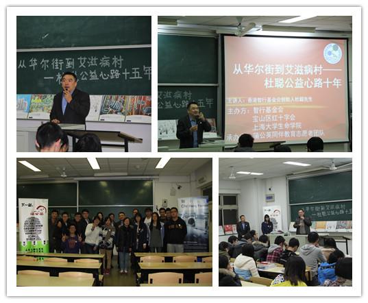 慈善公益作为一项需要全人类共同关注的事业,常常能将世界各地的慈善践行者们不约而同地聚集起来,成为更大的正能量,传播到更广泛的区域。2014年12月9日晚上6点30分,在上海大学AJ304教室中就举行了这样一场内涵丰富、意义深远的慈善公益讲座。在上海大学蒲公英同伴教育团队的盛情邀请下,香港智行基金会创始人杜聪来到上海大学,以“从华尔街到艾滋病村——杜聪公益心路十五年”为题,为上大学子分享和传播了他和他的团队的一份热忱的慈善公益情。