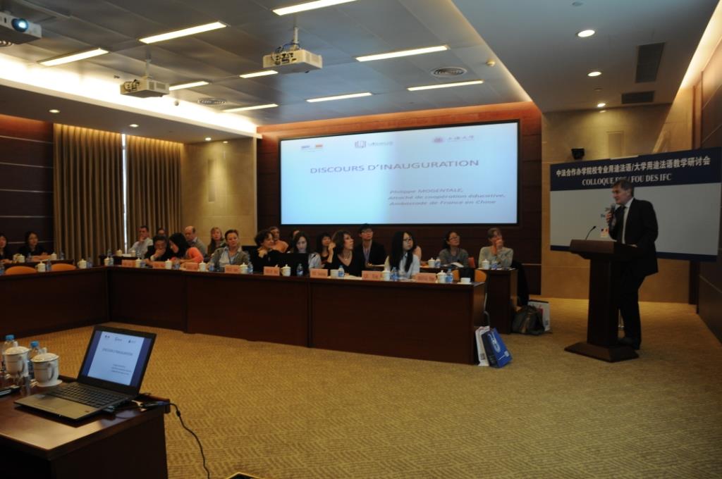 深秋的上海大学金菊飘香,高朋满座。11月27日至30日,上海大学中欧工程技术学院与法国驻华大使馆成功举办了“第二届中法合作办学学院专业用途以及大学用途法语教学研讨会”,法国驻华大使馆教育合作处专员毛飞(Philippe Mogentale)、法国驻上海总领事馆语言与教学项目官员夏一诺、上海法语联盟主任Pascale Delpech、法国巴黎工商会语言中心教学负责人Dominique Frin、Sonia Issolah、中欧学院党委副书记李志芳、副院长张建华等领导嘉宾出席了开幕式。目前国内各主要中法合作院校——北京航空航天大学中法工程师学院、中国民航大学中欧航空工程师学院、中山大学中法核工程与技术学院、中国人民大学中法学院和上海交通大学巴黎高科卓越工程师学院等中法教师代表,法国驻上海总领事馆、上海法语联盟、巴黎工商会等机构代表共计50余人参与大会。本次会议是“中法建交50周年”系列纪念活动之一,是中国法语教育界一次重要会议。