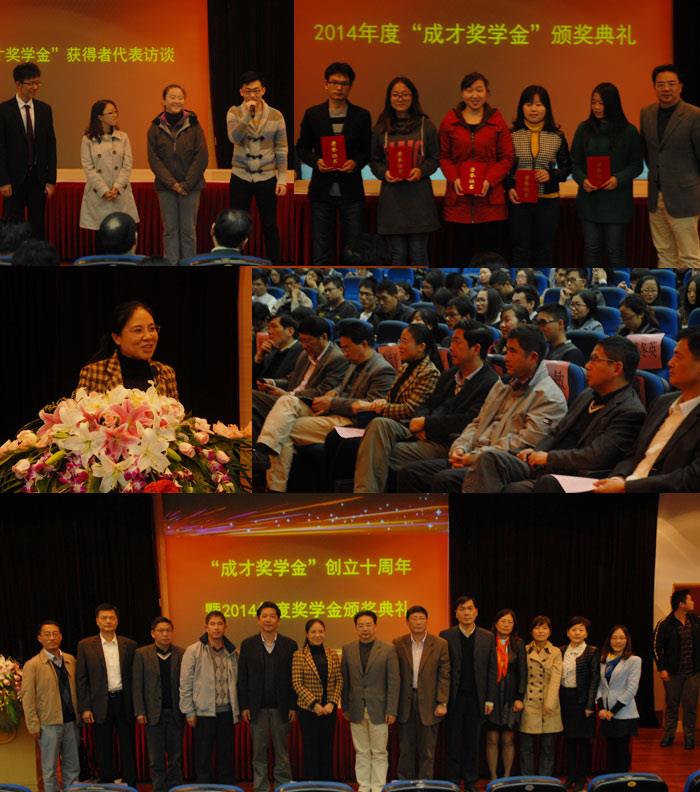 11月16日下午,环化学院在J楼202成功举办了“成才奖学金”创立十周年暨2014年度奖学金颁奖典礼。宝山区上海大学校友会会长、宝钢股份有限公司党委常委、纪委书记李世平,副会长、宝钢工业技术服务有限公司副总经理解建平,上海大学副校长、环化学院党委书记兼执行院长吴明红,上海合作组织公共外交研究院院长、音乐学院直属党总支书记李伟等领导和嘉宾出席典礼。出席典礼的还有宝山校友会校友、历届成才奖学金获奖代表及环化学院师生。