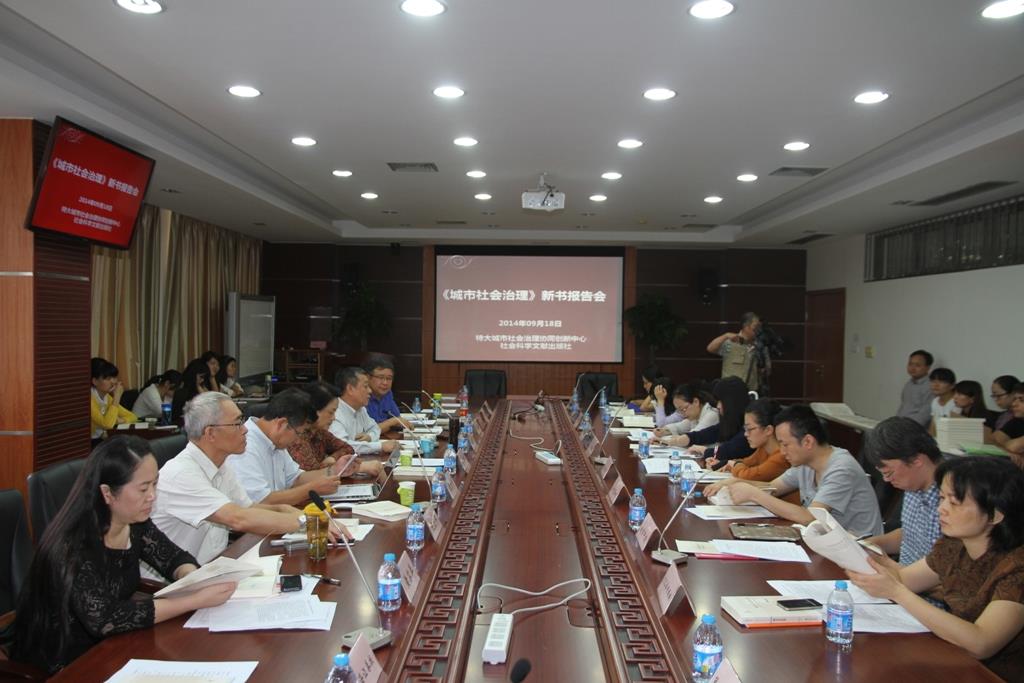 《城市社会治理》新书报告会于2014年09月18日下午2点在上海大学宝山校区B417室召开。中国社会学会秘书长、社会科学文献出版社社长谢寿光,中国社会学会副会长、上海大学党委副书记、副校长李友梅,特大城市社会治理协同创新中心有关人员,新书作者以及16余家新闻媒体记者参加了会议。