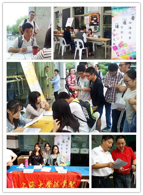 上海大学第17届全国推广普通话宣传周语言文字法律法规宣传活动日前在校内外分别举行。2014年9月18日中午,法学院团委、学生会组织志愿者在益新、水秀食堂前开展了形式新颖、趣味盎然的普通话宣传推广活动。本次活动由上海大学语委、教务处、团委主办,法学院团委、学生会承办,主题为“说好普通话,圆梦你我他”。