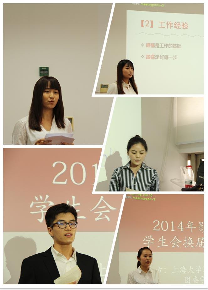 2014年9月12日下午三点整在上海大学宝山校区a楼北区4003会议室举行了上海大学影视学院学生会2014-2015届主席团换届大会。出席本次活动的有影视学院团委书记严瑶老师,各班班长、团支书,原影院学生会主席团成员,二十多名学生会骨干以及八名经前期推选参与主席团竞选的候选人组成。