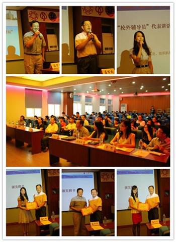 刘亮介绍了理学院聘任“校外辅导员”及开展“大学生成才讲坛”的目的、意义及此次受聘的四位“校外辅导员”。盛万成代表理学院为受聘“校外辅导员”颁发了聘书,同时代表学院感谢他们在繁忙的工作之余担任大学生的人生导师。他指出,聘请“校外辅导员”是一种通过社会合作培养人才的有效途径,能够更好的培养学生的精神、信念,为学生进一步了解社会提供帮助和指导。期待双方在此基础上能有更好的合作与共建。“校外铺导员”代表黄铁红在发言中谈到,“校外辅导员”是一种资源对接,可以为学生提供经验,能和大家一起分享、感悟、成长,她鼓励大学生在这一青春加油站里不断提升综合素养。