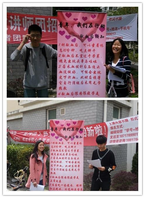 4月25日,信鸽社成员在上海大学宝山校区新世纪寝室楼7幢前宣传着献血前后的注意事项。尽管天气不好,但是前来咨询的人仍有很多。令人印象深刻的是,刚好有一名大一的同学献完血回来,手里拿着献血后的纪念品,信鸽社社员看见他似乎有点虚弱的样子,便走上前去,咨询他是否有不舒服的症状,他点了点头,这时社员就向他仔细讲述了献血后的注意事项。