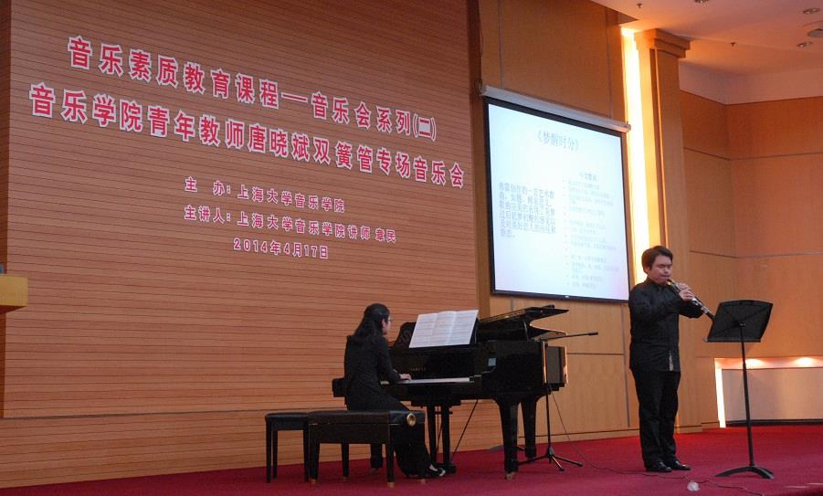 作为上海大学最新推出的音乐素质教育课程——音乐会系列(二),昨晚,上海大学音乐学院青年教师唐晓斌双簧管专场音乐会在上海大学校本部图书馆报告厅成功举办。上海大学副校长、音乐学院院长叶志明及音乐学院院系领导与现场观众共同观看了音乐会。