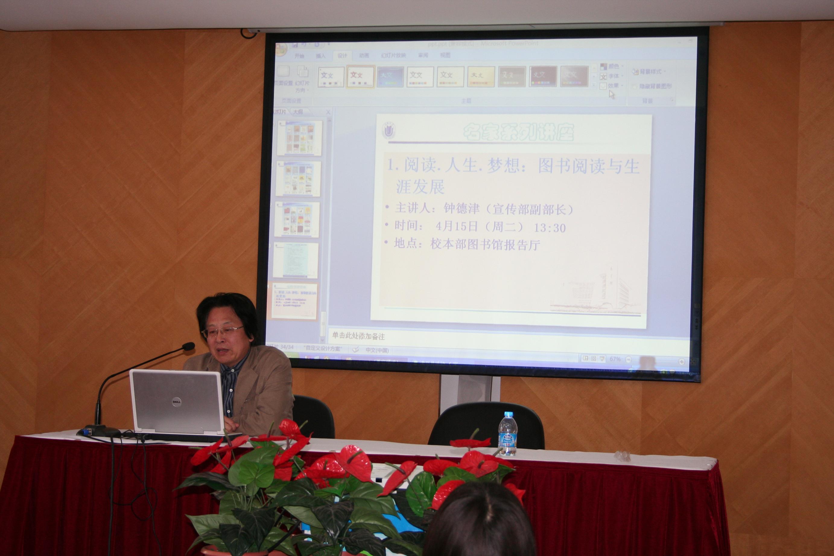 2014年4月15日下午,主题为“阅读、人生、梦想:图书阅读与生涯发展”专题讲座在校本部图书馆二楼报告厅隆重开幕,上海大学宣传部副部长钟德津老师担任本次讲座主讲。