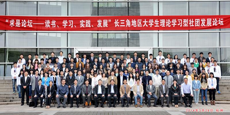 3月29日至3月30日,由中共浙江省委宣传部、共青团浙江省委、中共浙江省委教育工委、浙江省学生联合会、浙江大学共同主办的2014长三角地区大学生理论学习型社团发展论坛在浙江大学举行,长三角地区5省市43所高校的百余名理论学习型社团骨干参与论坛。我校泮溪爱智社蔡秋雨和震雅诗社李晔两位同学作为社团代表应邀参加论坛。本次论坛主题是“读好书,共享理论盛宴;齐奋斗,同创青春梦想”。