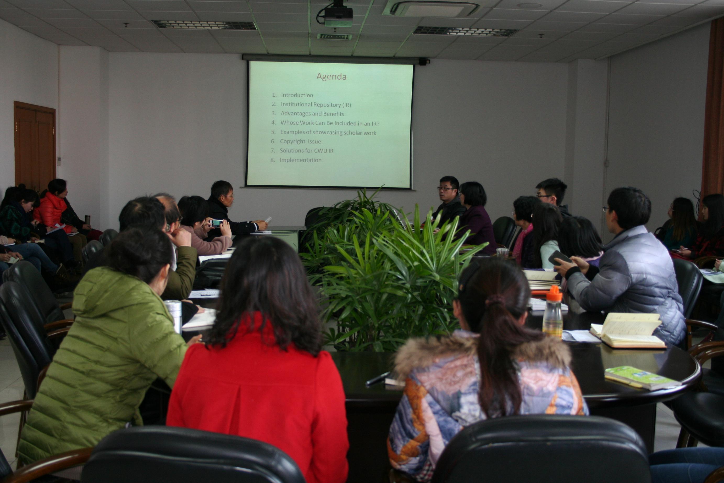 2014年3月14日上午,应上海大学图书馆邀请,美国中央华盛顿大学(Central Washington University)图书馆系统部总负责人傅平先生前来校图书馆作《机构库服务与发展》学术报公告会,图书馆副馆长刘华主持报告会,馆办公室、资源建设中心、读者服务中心、信息服务中心等部门同仁近40人参加报告会交流,上海地区部分高校图书馆同仁也前来参加交流。