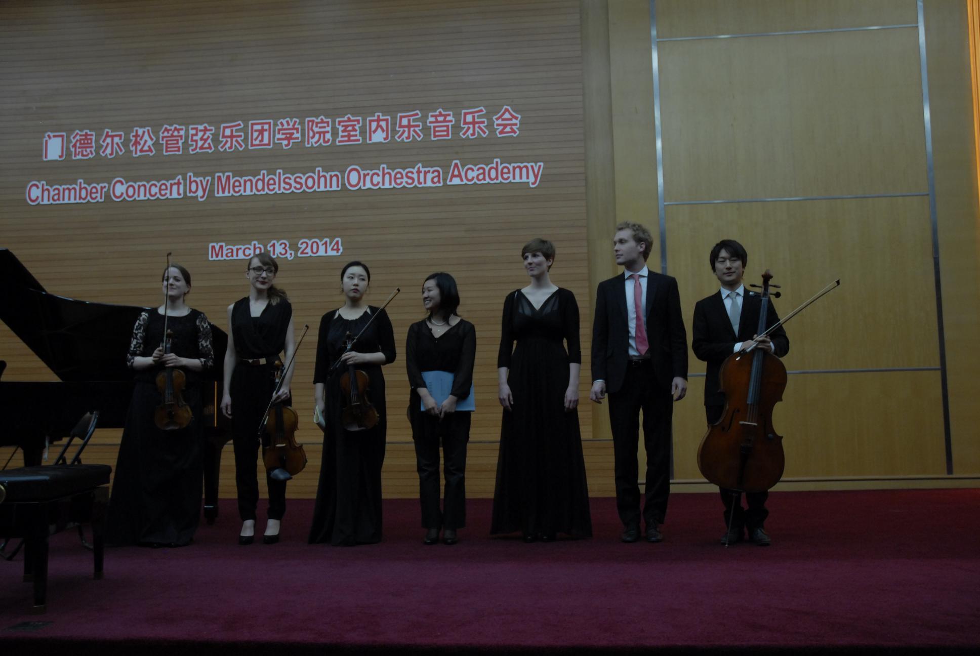 应上海大学音乐学院的邀请,世界上久负盛名的门德尔松管弦乐团学院的部分演奏家于昨晚访问我校,并在我校图书馆报告厅举办专场室内乐音乐会。这也是这支古老的乐团首次走入上海高校进行室内乐演出。上海大学副校长、音乐学院院长叶志明,音乐学院副院长、艺术总监夏小曹教授,音乐学院副院长卿扬等领导出席了音乐会。