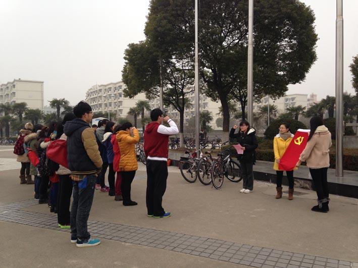 2014年2月24日早上7时30分,上海大学影视艺术技术学院学生会与12级学生党支部共同策划了一次在图书馆前集体升旗仪式,及预备党员宣誓活动。参加本次活动的有影视艺术技术学院党组织员徐芬芳老师、6名预备党员和部分入党积极分子。这天天气阴冷,却丝毫没有阻挡大家的热情。级学生党支部成员率领积极分子,与学生会升旗同学一起,在图书馆前进行了庄重的升旗仪式。接着进行了庄重的入党宣誓仪式,每一位预备党员都右手握拳,12届党支部的杨鸽同学作为领誓人,一字一句地跟着说出坚定的誓言。