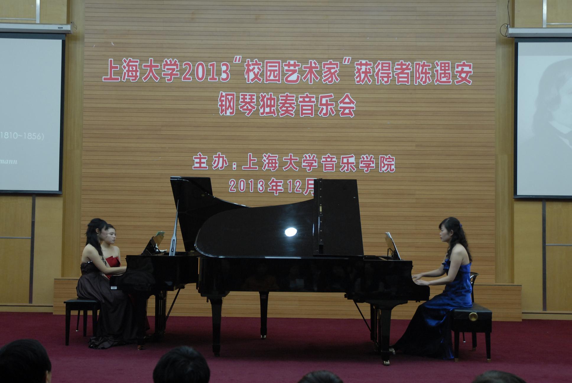 12月5日晚19:00,上海大学艺术团钢琴协会成员、2013“校园艺术家”获得者陈遇安在我校图书馆报告厅成功举办了“Somewhere in time”个人钢琴独奏音乐会。