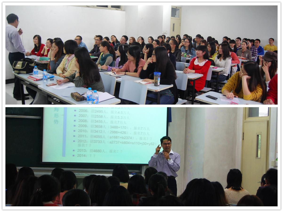 接着,王君深入浅出的分析了历年公考在科目、内容和分数划分上的变化,指出了行测、申论这两个考试科目在命题上的重点,建议同学们提高常识应用能力和综合分析能力,同时更以历年比较有代表性的题目为在座学生讲解了解题的技巧和思路。随后,在复习策略和答题策略上,王君希望大家从三个层面即“道、术、知”积极进行准备,赢得在场70余名同学的一致赞同和掌声。同时,他提醒学生一定要注意从命题官角度和公务员身份上考虑问题,了解自己和认清他人;不仅要注意关注国家大事以及热点时评,还要关注领导讲话、政府工作报告、重要文件与会议,如十八大报告、8.19讲座、十八届三中全会决议等。同时,他鼓励大家可以通过微博、博客和邮件的形式与其多沟通。整场讲座气氛轻松而融洽。