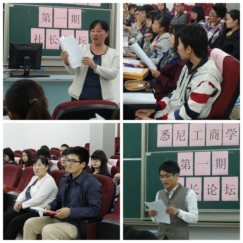 2013年10月18日下午14时,上海大学悉尼工商学院第一期社长论坛于文德楼一楼报告厅如期召开。学院团委书记张明明老师、学生会社团联合部部长陈璟家浩、学院各大社团主要负责人出席了此次论坛。