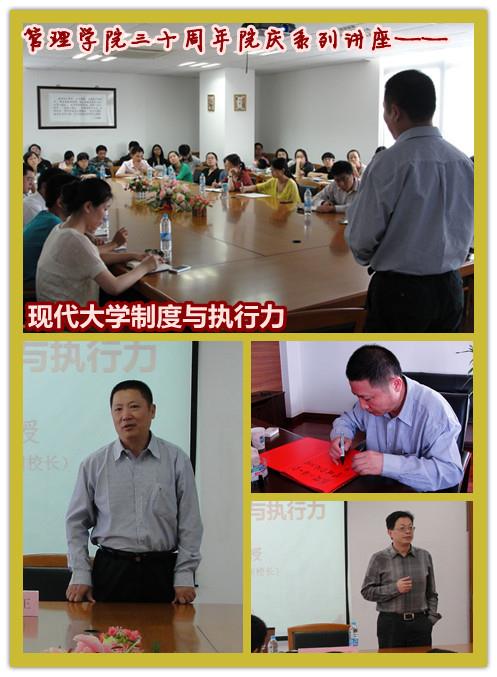 在目前全国高校纷纷制定完善大学章程的大环境下,覃正教授的的传经送宝可谓雪中送炭。此次讲座由管理学院尤建新院长主持,多位校部处、兄弟学院领导,以及众多管理学院师生现场聆听交流,大家就“校院两级管理”、“新老制度过渡”、“传统学科的发展”等问题与覃正教授进行了热烈的讨论,为学校如何提升建设水平,学院如何提升治理水平提供了诸多建议。尤建新院长在总结时也谈了三点体会:学生、教师、行政管理人员都是学校的主人,如何办好学校依靠大家的共同努力;青年教师应该改变现有的教学科研方法来适应新形势的发展;管理类的学生不但要思考别人后天做什么梦,更应该努力思考如何替别人造梦。