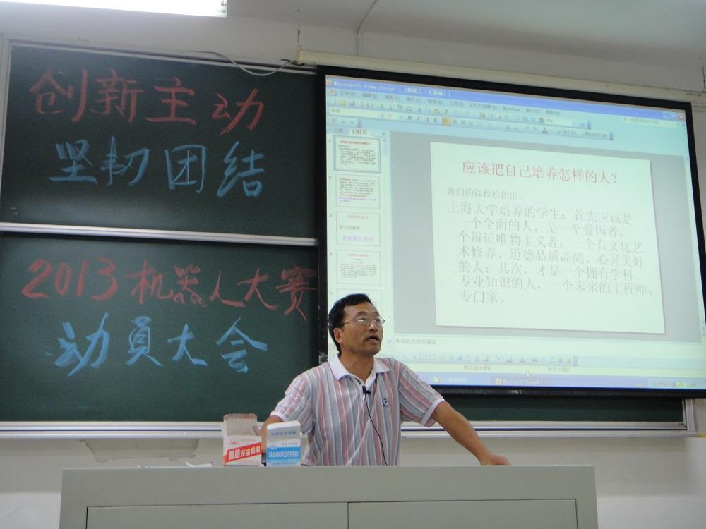 由中国自动化学会机器人竞赛工作委员会、RoboCup中国委员会、科技部高技术研究发展中心主办的中国最高水平的机器人赛事----2013中国机器人大赛暨RoboCup公开赛将于2013年10月18-20日在安徽省合肥市举行。2013年9月28日(星期六)下午,上海大学自强队在延长校区一教406室特地举行了自强队参加该赛事的动员大会。本次大会由自强队的指导老师陈万米、自强队队员戴骊融主持,上海大学机自学院团委书记何山青老师做了发言。