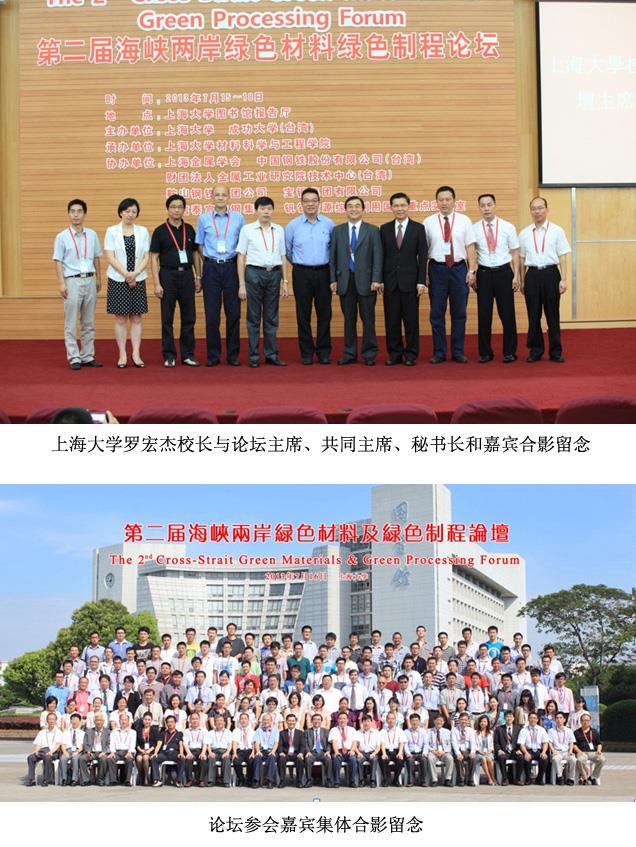 2013年7月15-18日,第二届海峡两岸绿色材料及绿色制程论坛(The Second Cross-Strait Green Materials and Green Processing Forum)在上海大学顺利召开,此次论坛由上海大学和成功大学(台湾)联合主办,上海大学材料科学与工程学院承办,上海市金属学会(大陆)、中国钢铁股份有限公司(台湾)、财团法人金属工业研究发展中心(台湾)、鞍山钢铁集团公司(大陆)、宝钢集团有限公司(大陆)、中信泰富特钢集团(大陆)、钒钛资源综合利用国家重点实验室(大陆)等七家单位协办。此次论坛的主席由上海大学校长助理翟启杰教授和台湾成功大学研发长黄文星教授担任,执行主席是上海大学材料学院院长张捷宇教授、材料学院党委书记朱明原教授以及攀钢集团研究院有限公司教授级高工孙朝晖先生。论坛旨在促进海峡两岸材料科学领域的交流与合作,推动海峡两岸绿色材料和先进制备技术的发展。