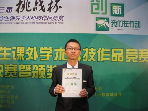 6月2日,第十三届挑战杯上海市大学生课外学术科技作品竞赛终审决赛和颁奖典礼在上海师范大学隆重举行。理学院化学系09级应用化学专业的马俊伟同学以一篇自然科学类论文《水溶性柱[5]芳烃对碱性氨基酸的选择性键合研究》荣获挑战杯上海市大学生课外学术科技作品竞赛一等奖。