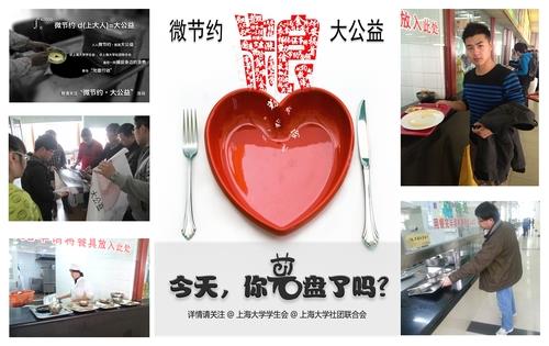 这两周,适逢上海大学冬季学期的考试周。尽管校园里充满着浓厚的学习氛围,但是一场强烈的“节约”风这几天已经悄然在上大校园中刮起。由上海大学学生会发起的“微节约 大公益”活动正式启动,同学们开始积极加入到上海市“校园光盘联盟”中去。