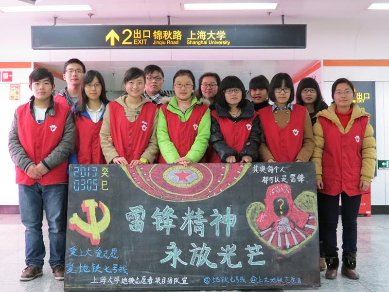 2013年3月5日,是毛泽东等老一辈革命家为雷锋同志题词50周年。为进一步贯彻落实党的十八大会议精神,践行社会主义核心价值,弘扬和实践雷锋精神,我们上海大学地铁志愿者服务队决定以学雷锋日为契机,提前两天在3月3日周末地铁站客流量大时,在上海大学地铁站开展“学雷锋”特别活动。