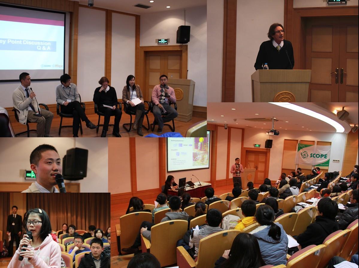 2013年1月15日18:30,上海大学SCOPE生涯发展教育系列活动第一次活动在宝山校区J楼201举行。本次活动邀请了来自福特汽车公司亚太非地区的四位经理和一位校友作为嘉宾:营销服务部经理John Keane、IT部电子项目经理William Huang、财务部项目经理Leon Liu、营销服务部副经理Kanida Thuravatikul、上大12级毕业生SCOPE学员张悦。本次活动吸引了近200名同学参与,招毕办相关老师也出席了本次活动。