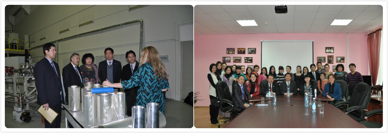 访问的最后一站是欧亚大学物理技术系。在系主任阿·阿基尔别科夫的带领下参观核物理研究所和功能氧化物薄膜实验室。实验室负责人阿·马申特采娃和俄罗斯籍客座教授特·依涅尔巴耶夫介绍了粒子加速器及其刻蚀技术、人工纳米膜方面的研究成果。蔡传兵用英文做了“实用高温超导材料及其电力应用”的报告,展示了上海大学第二代高温超导带材方面的研究和应用。双方就建立联合实验室与联合培养研究生达成共识。