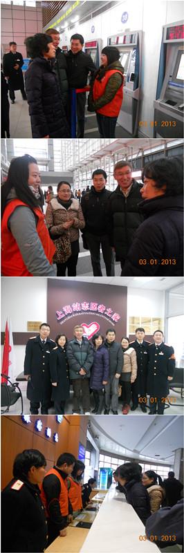 2013年1月3日上午,在上海火车站团委书记陈浩、全国服务明星从上珠、上海市世博微笑形象大使汤杰等的陪同下,上海大学法学院党委书记胡建国、上海大学学生成才服务中心汤琳夏、法学院党委副书记傅新华、法学院团委副书记林建玲冒着寒风和飘雪来到上海火车站慰问元旦期间仍在火车站开展志愿服务的同学们。