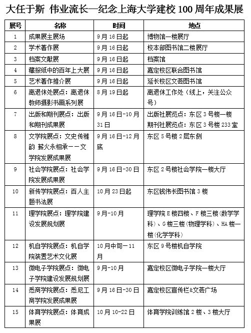2022年是上海大学建校100周年,从“文有上大,武有黄埔”的红色学府到上海市属、国家“211工程”重点建设的综合性大学、国家“双一流”建设高校,一代代“上大人”同舟共济,孜孜奋斗,在诸多领域均取得了丰硕的成果。为全面反映上海大学建校百年来的重大成果、展现新时代上大人自强不息的精神风貌,学校将主办“大任于斯 伟业流长—纪念上海大学建校100周年成果展”,包括成果展主展场、学术著作展、档案文献展、馆藏报纸中的百年上大展、艺术著作推介展以及部门学院特色展览,欢迎广大师生前来观展。