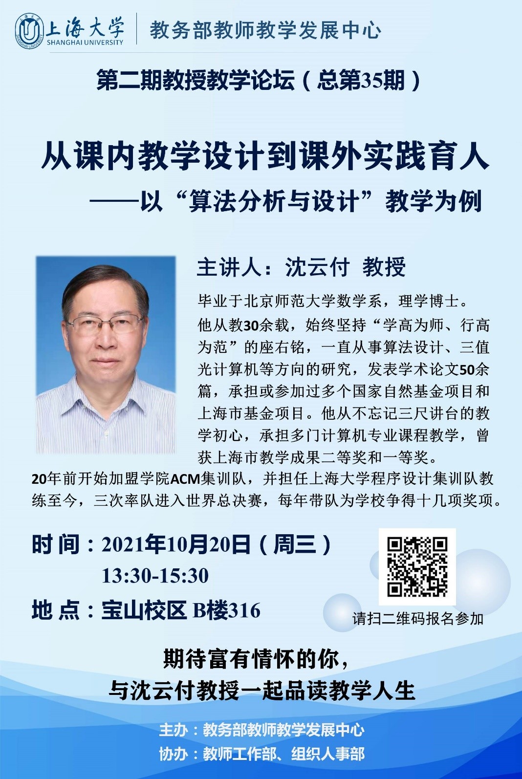 上海大学教务部教师教学发展中心第二期教授论坛(总第35期)从课内教学设计到课外实践育人——以“算法分析与设计”教学为例