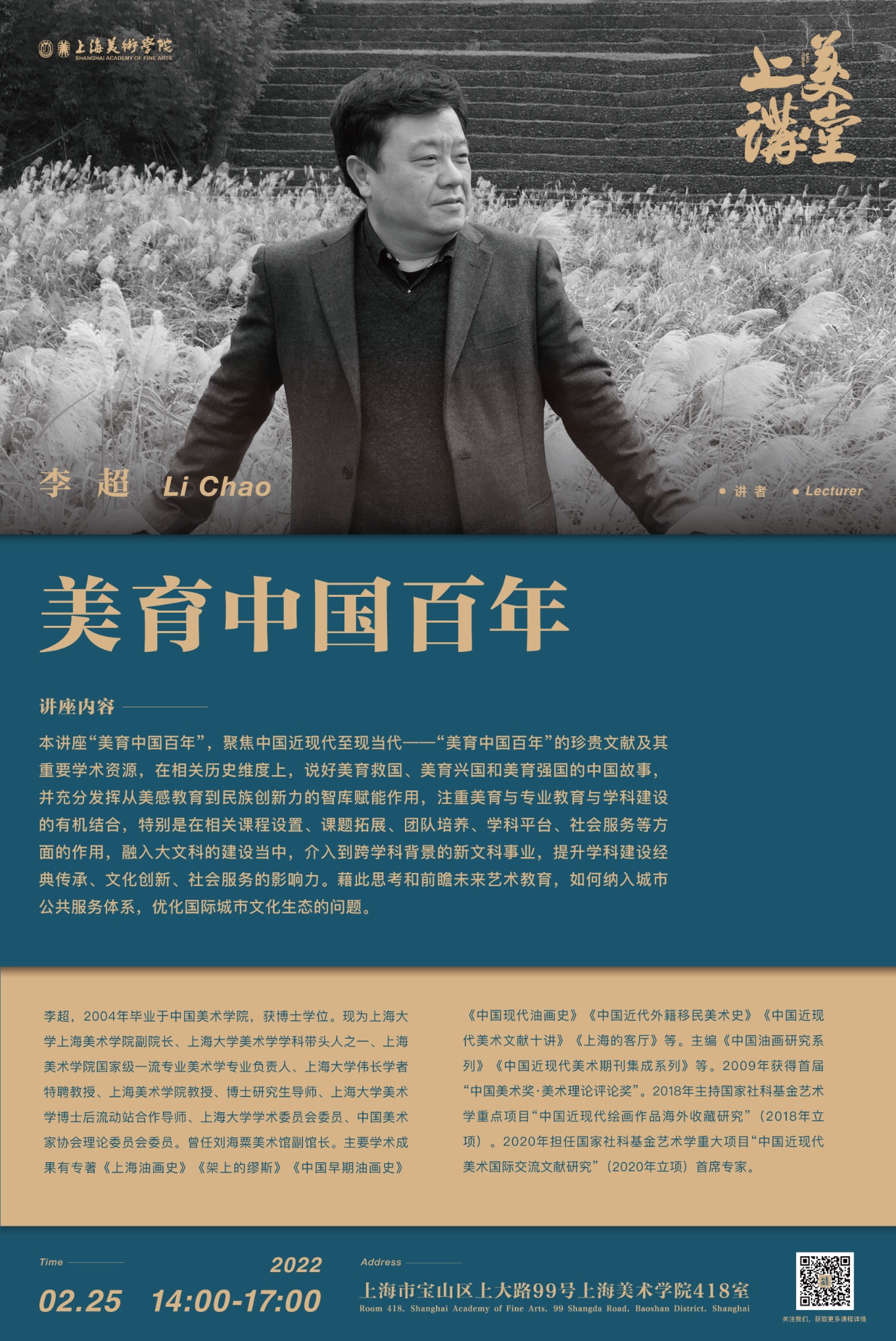 个人简介:李超,2004年毕业于中国美术学院,获博士学位。现为上海大学上海美术学院副院长、上海大学美术学学科带头人、上海大学伟长学者特聘教授、上海美术学院教授、博士研究生导师、上海大学美术学博士后流动站合作导师、上海大学学术委员会委员、中国美术家协会理论委员会委员。主要学术成果有专著《上海油画史》、《架上的缪斯》、《中国早期油画史》、《中国现代油画史》、《中国近代外籍移民美术史》、《中国近现代美术文献十讲》、《上海的客厅》等。主编《中国油画研究系列》、《中国近现代美术期刊集成系列》等。2009年获得首届“中国美术奖·美术理论评论奖”。2018年主持国家社科基金艺术学重点项目“中国近现代绘画作品海外收藏研究”(2018年立项)。2020年担任国家社科基金艺术学重大项目“中国近现代美术国际交流文献研究”(2020年立项)首席专家。